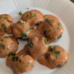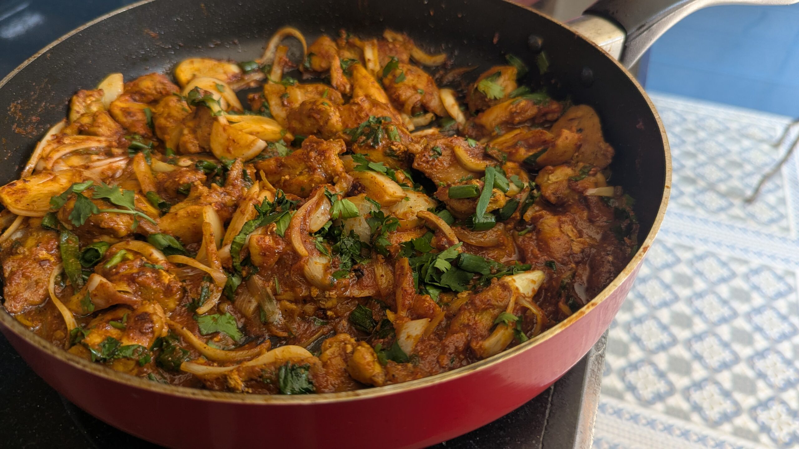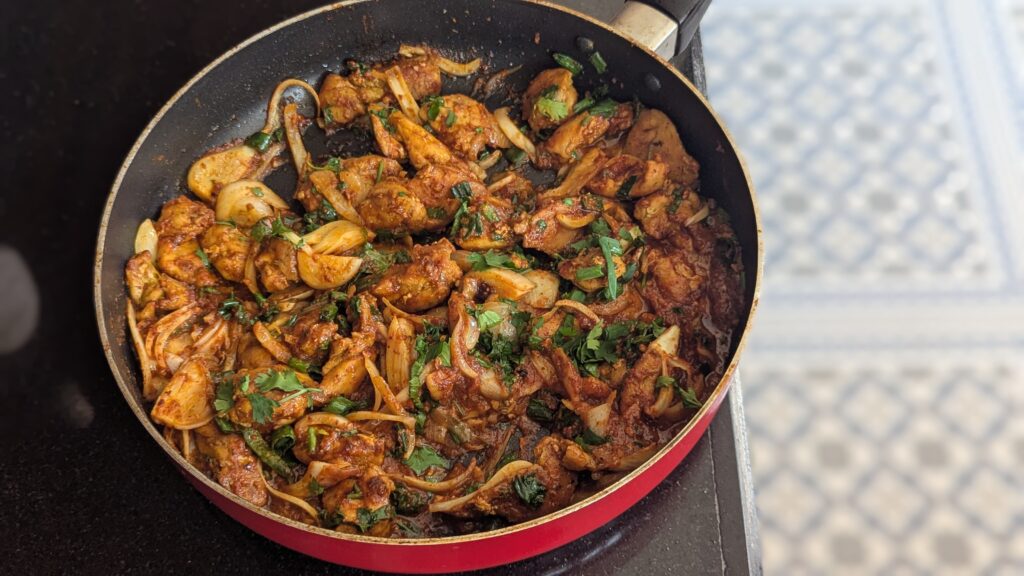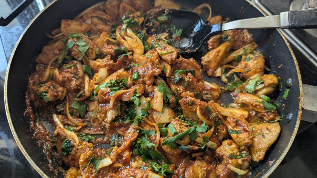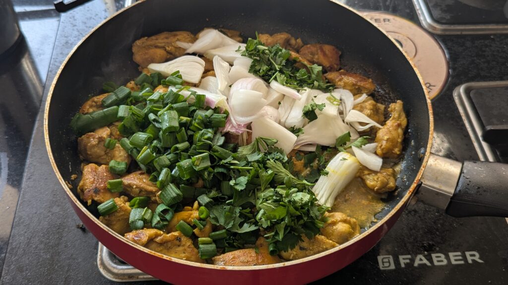 Heat a pan with the marinated chicken and cook on a high flame for 5 mins till the chicken chars on one side. Lower the flame and continue to cook for 8 minutes. Once cooked, add the chopped spring onions ( whites and greens ) and the coriander and let it cook for a minute. While it’s cooking heat some mustard oil in a small pot or ladle and then pour the hot oil over the spring onion and chicken mixtures. Cook for a minute. Add the tomato paste and continue cooking for another minute.