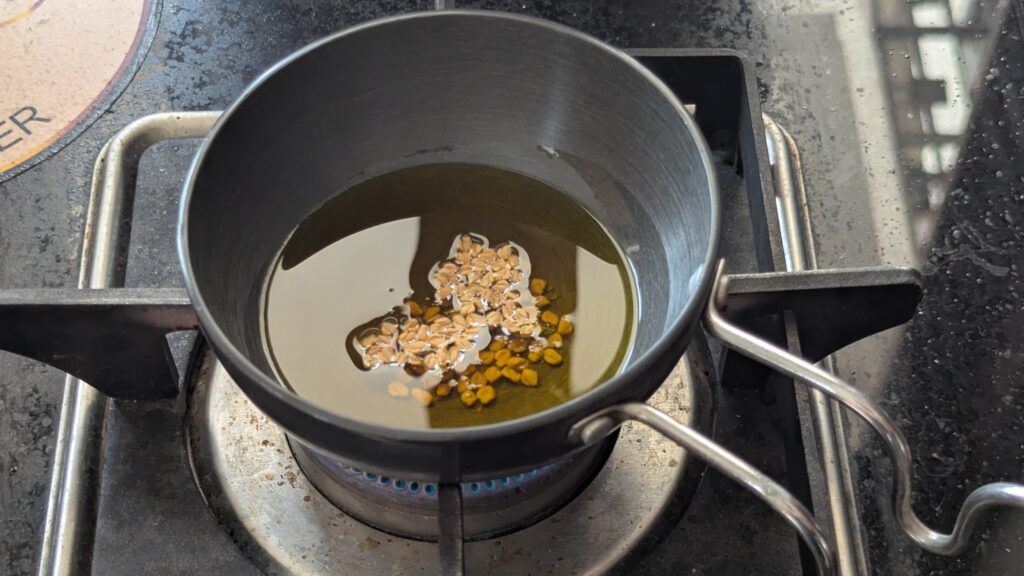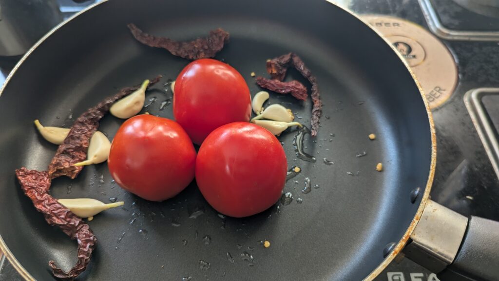 In a pan add a little mustard oil, the dried red chillies garlic and the three tomatoes, cover and let it cook till the tomatoes blister. If the chillies and garlic are cooked take them out to cool and let the tomatoes cook longer. Once cooked, peel the skin off and set aside to cool with the garlic and chilies.