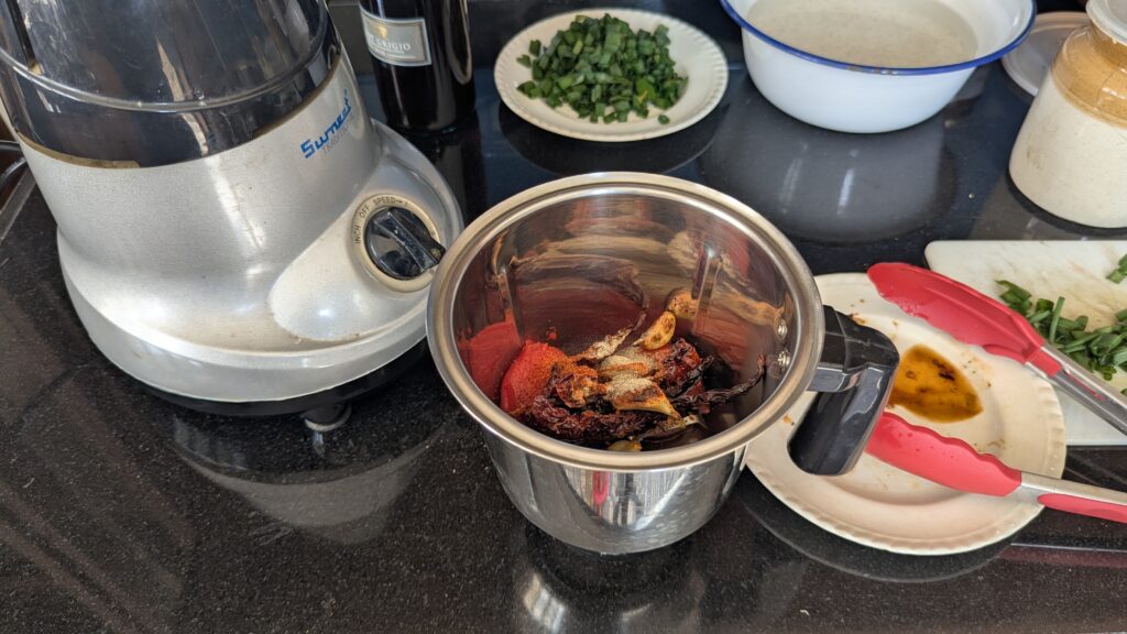 Once the mixtures cools add it to a blender along with red chilli powder and pepper ( some green chillies for extra heat if you like ) and blend it all into a paste. Set aside.