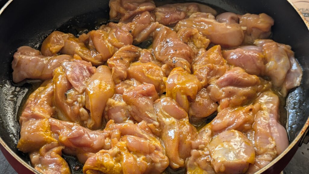 Marinate the chicken in mustard oil, salt pepper and turmeric powder and set aside.