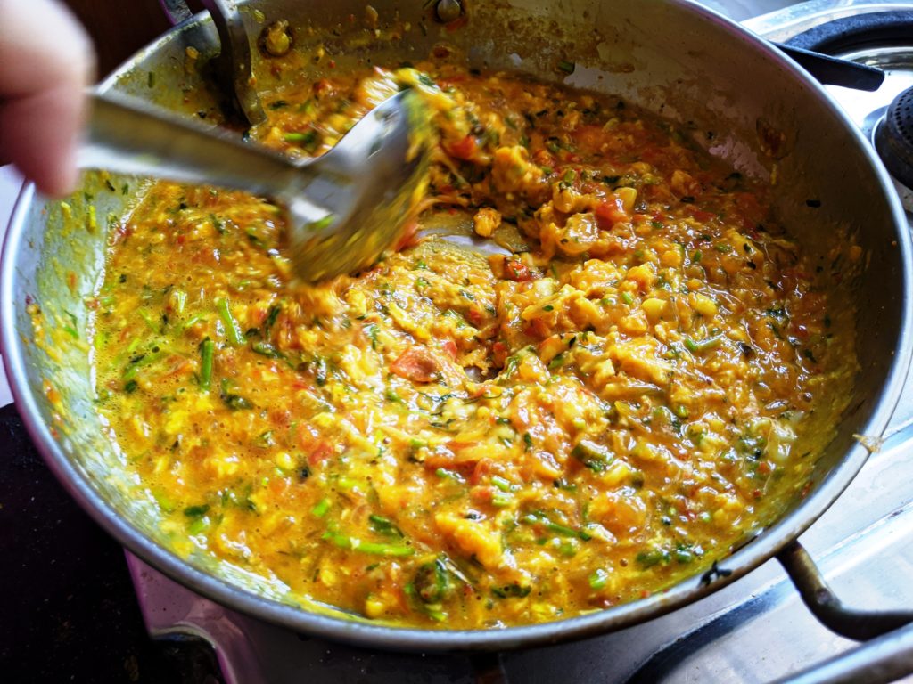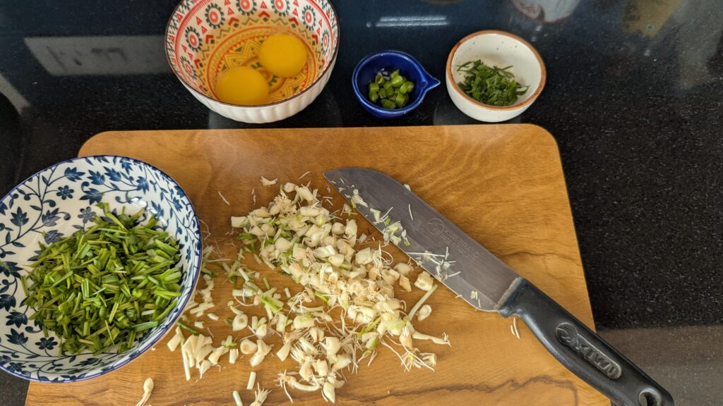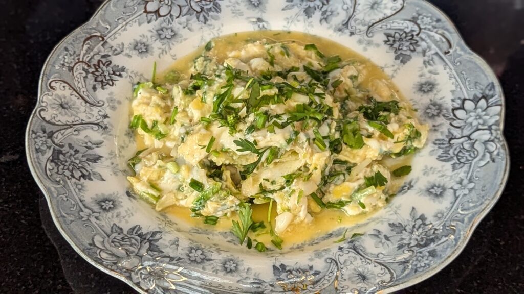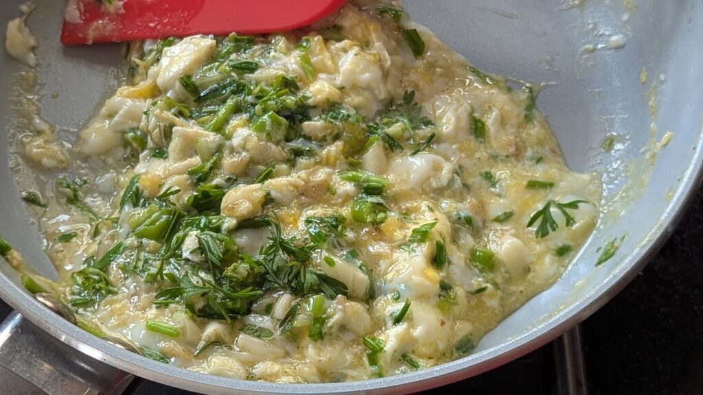 Cook the eggs into a light soft scramble along with the green garlic. Make sure it all mixes together and from time to time take the pan off the stove so the eggs don’t over cook and become a bhurji.