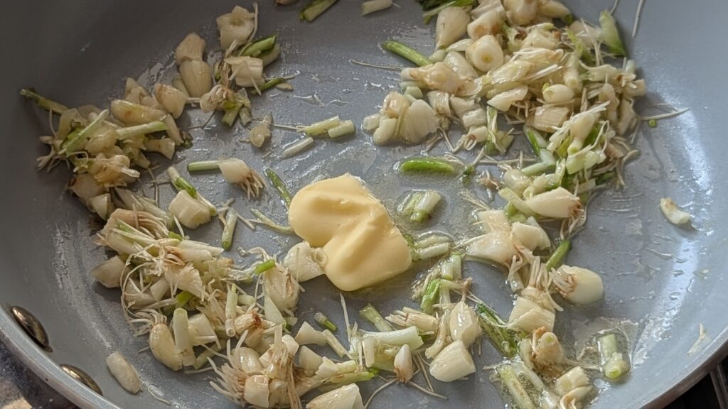 In a pan add the butter and oil (so the butter doesn’t burn) and add in the green garlic and cook for a couple of minutes. Add in the chopped chilies and cook both for a couple of minutes till it’ starts smelling fragrant.